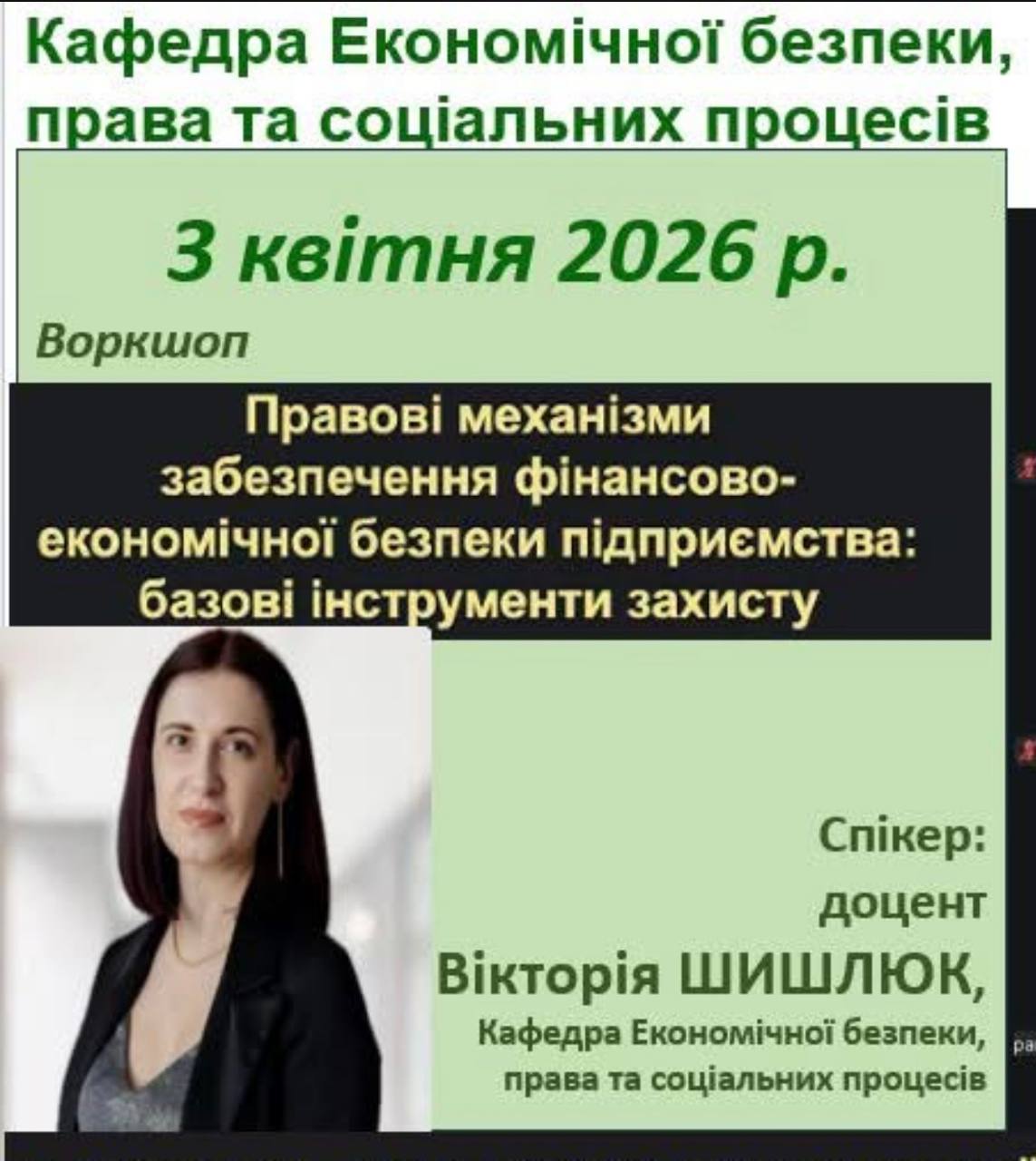 03.04.2026 року о 11.30 воркшоп для здобувачів й викладачів з напряму правових аспектів фінансово-економічного забезпечення на тему «Правові механізми забезпечення фінансово-економічної безпеки підприємства: базові інструменти захисту»