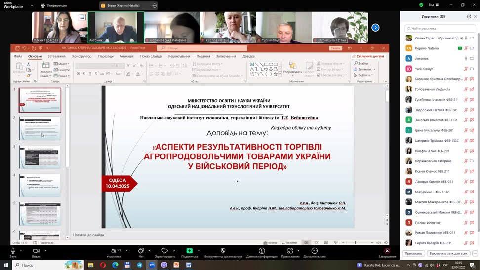 23 квітня 2025 року на кафедрі обліку та аудиту Навчально-наукового інституту економіки, управління і бізнесу ім. Г.Е. Вейнштейна в рамках 85-ї наукової конференції науково-педагогічного складу ОНТУ відбулось засідання секції «Облік та аудит» в он-лайн форматі. Цікаві доповіді, активна дискусія, результати дослідження та нові ідеї під час обговорення доповідей надав поштовх для нових досліджень.