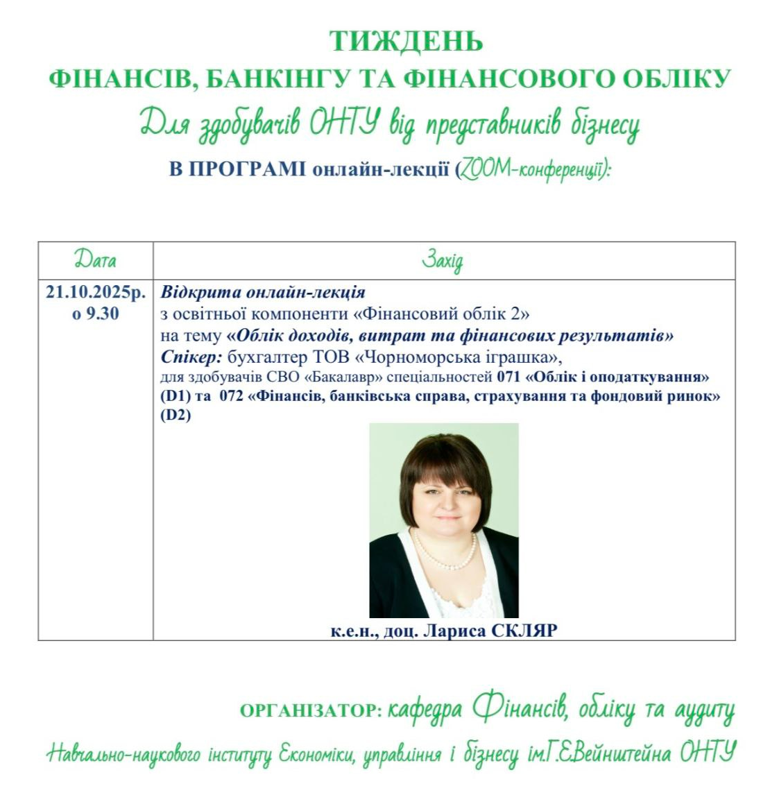 21 жовтня 2025 рокувідбуласьвідкрита онлайн лекція на тему «Облік доходів, витрат та фінансових результатів». Спікер: к.е.н. доц. Лариса СКЛЯР бухгалтер ТОВ “Чорноморська іграшка”.