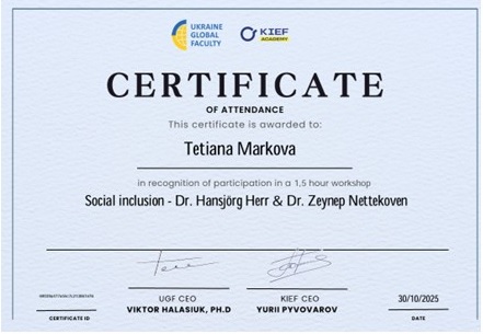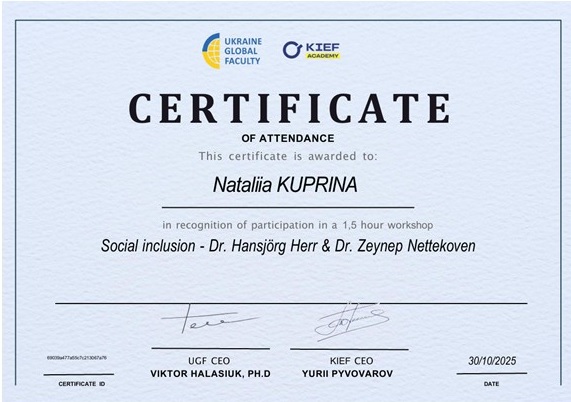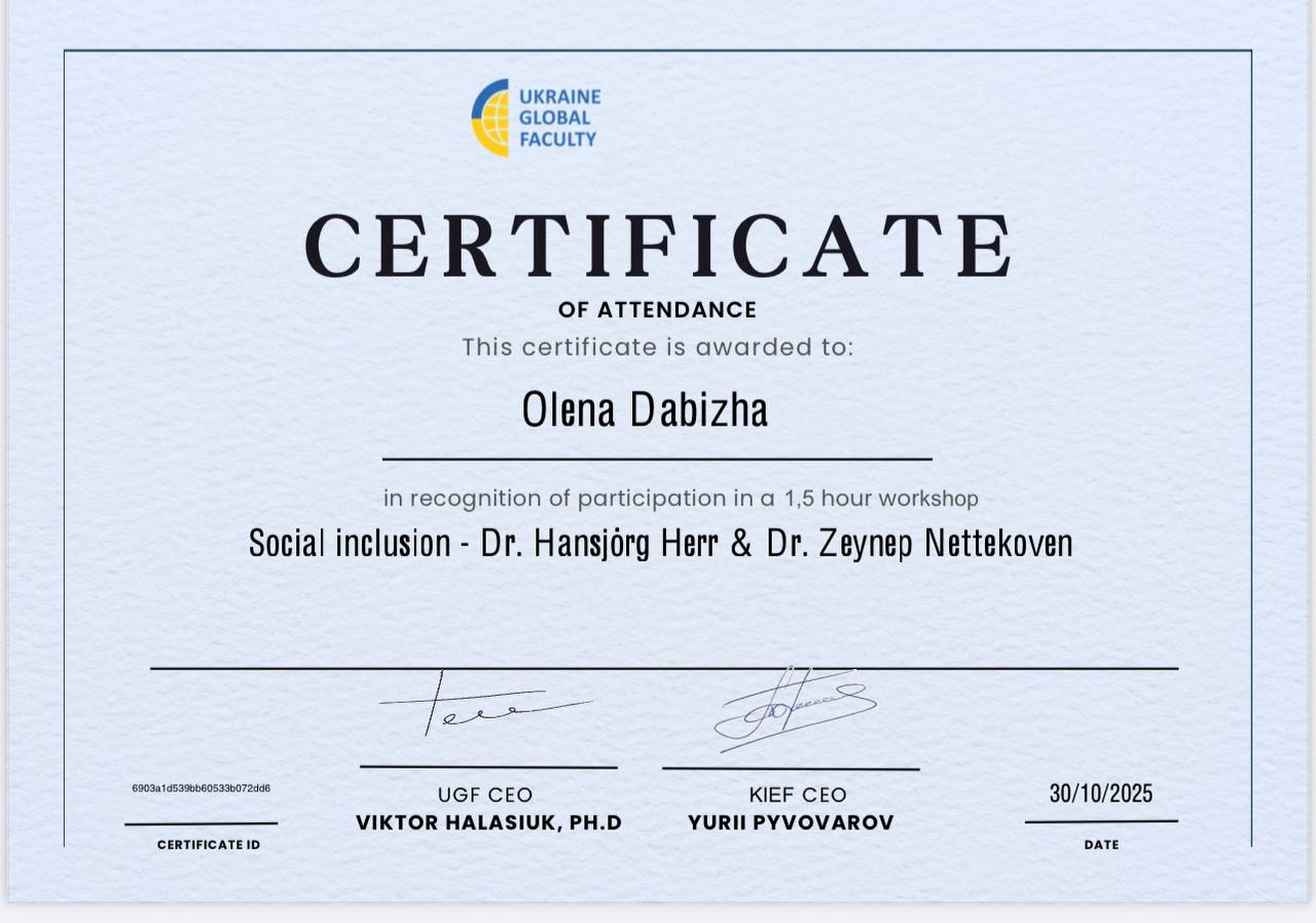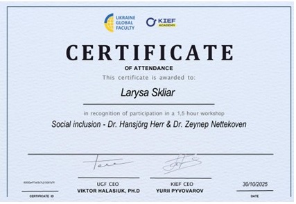 30 жовтня 2025 року відбувся семінар на платформі UKRAINE GLOBAL FACULTY на тему «Social inclusion»