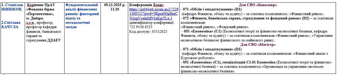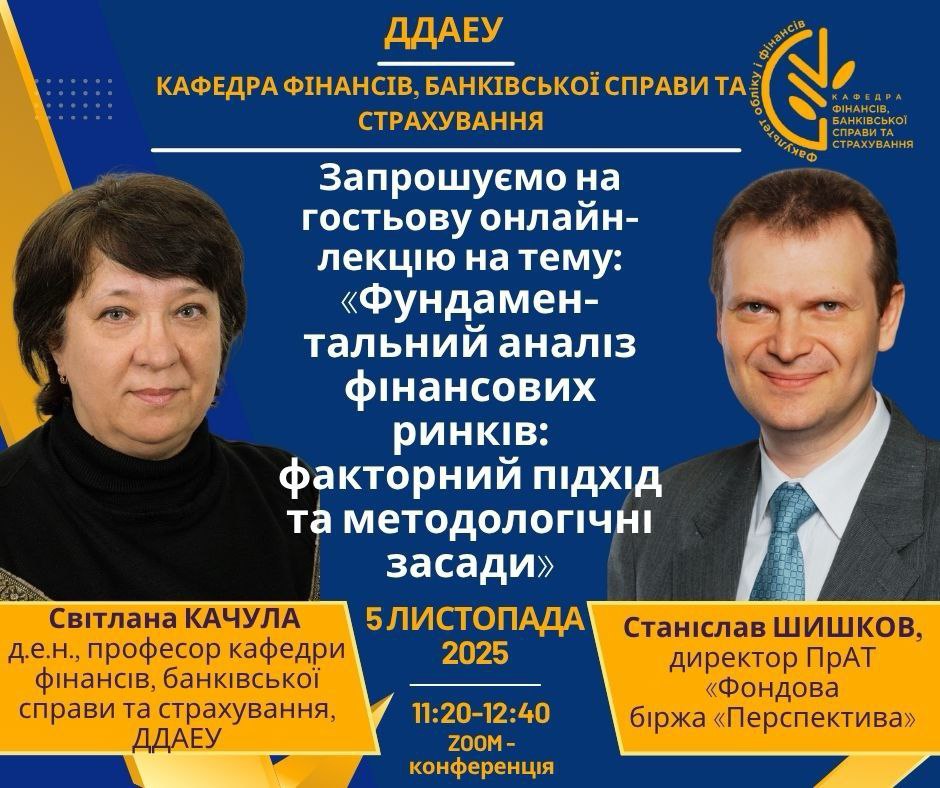 5 листопада 2025 року о 11:20 год для здобувачів третього (освітньо-наукового) та другого (магістерського) рівня вищої освіти відбудеться гостьова лекція на тему: «Фундаментальний аналіз фінансових ринків: факторний підхід та методологічні засади». спікери: Світлана КАЧУЛА, д.е.н., професор, професор кафедри фінансів, банківської справи та страхування ДДАЕУ, Станіслав ШИШКОВ, директор ПрАТ «Фондова біржа «Перспектива».