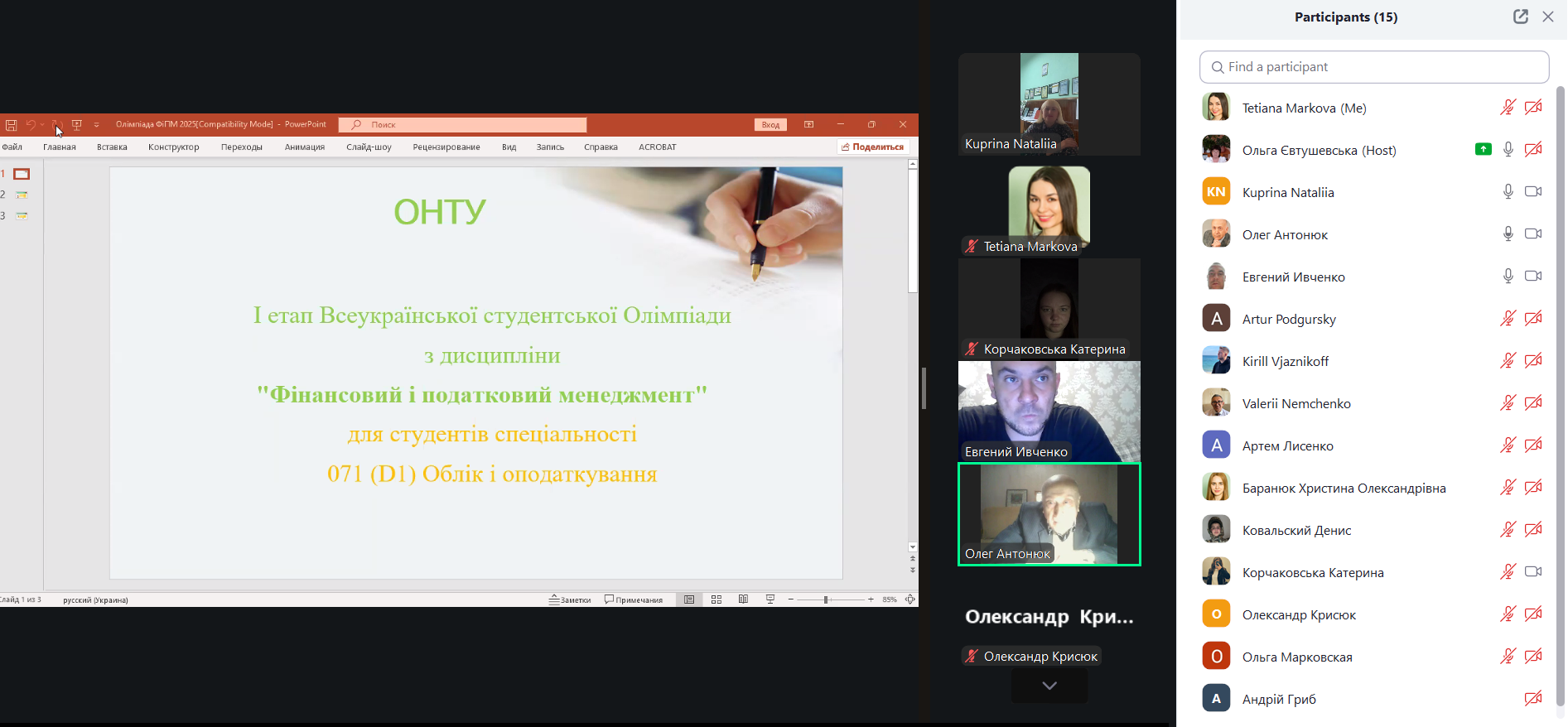 Сьогодні, 07.11.2025 р., на кафедрі фінансів, обліку та аудиту ОНТУ відбувся перший етап Всеукраїнської студентської Олімпіади з дисципліни “Фінансовий і податковий менеджмент”.