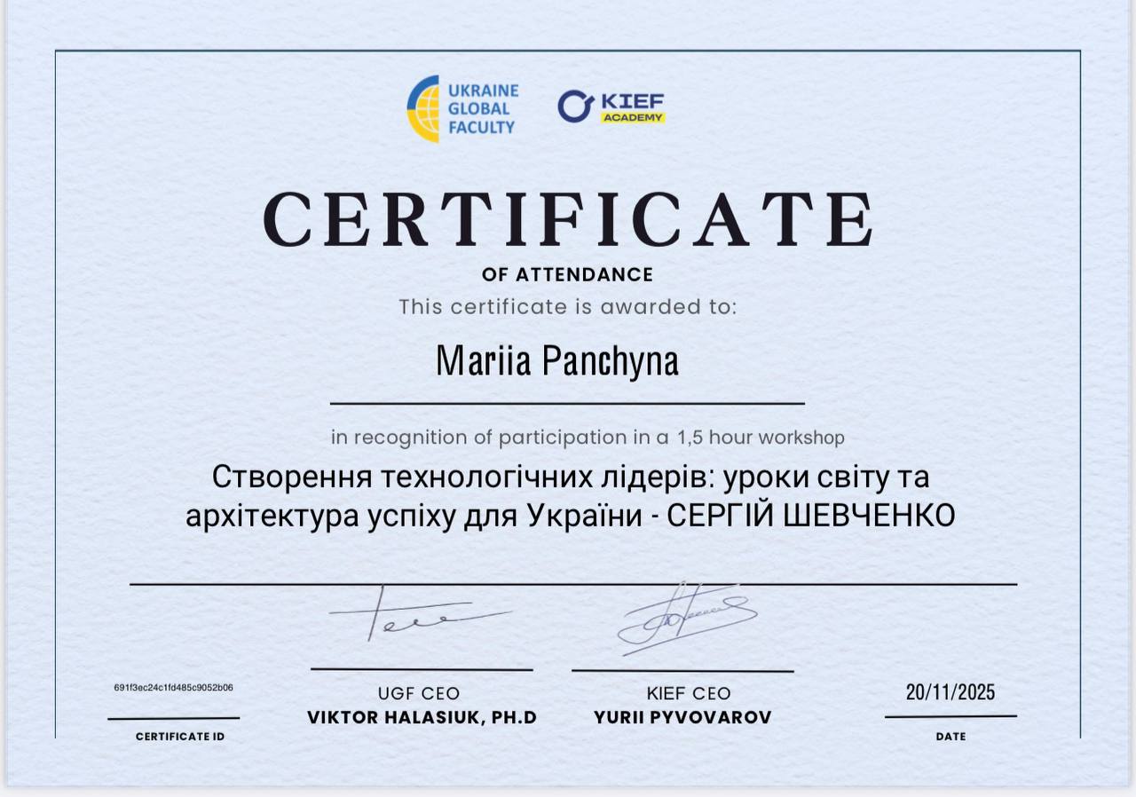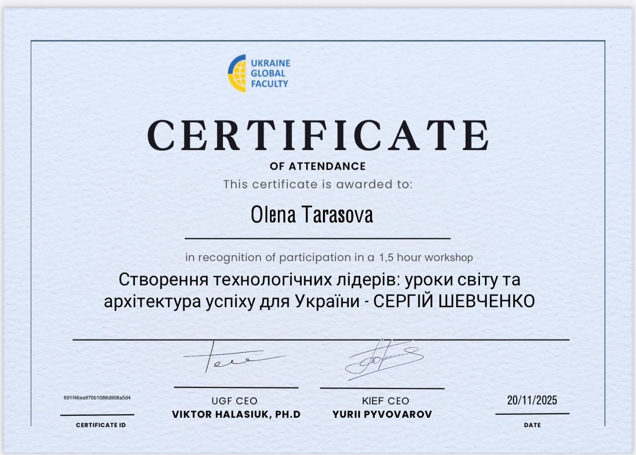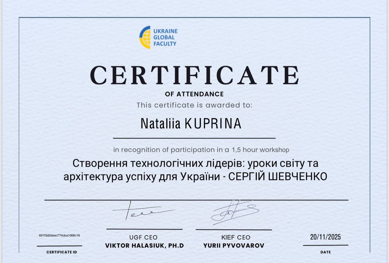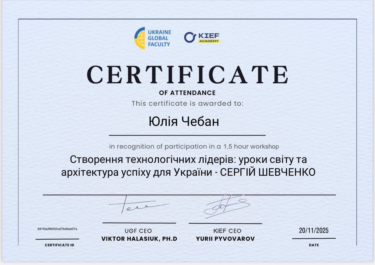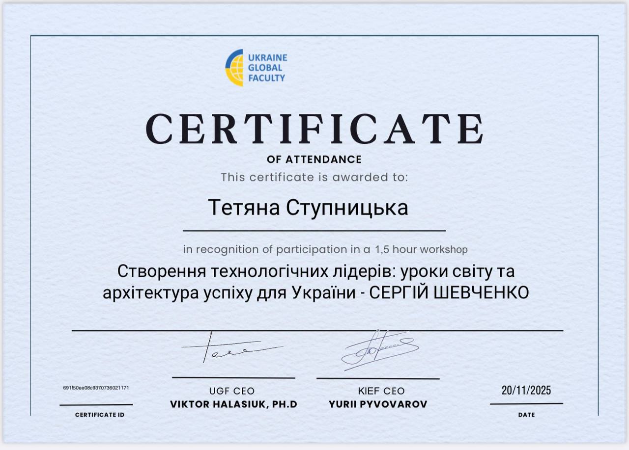 20.11.2025 року викладачі та здобувачі кафедри Фінансів, обліку та аудиту ОНТУ пройшли навчання на міжнародній платформі UKRAINE GLOBAL FACULTY на тему «Створення технологічних лідерів: уроки світу та архітектура успіху для України»