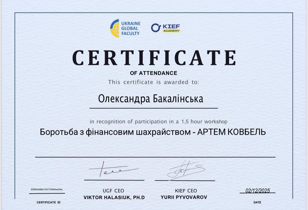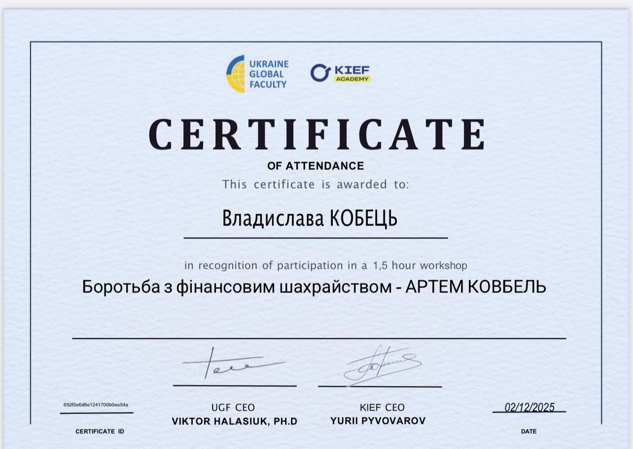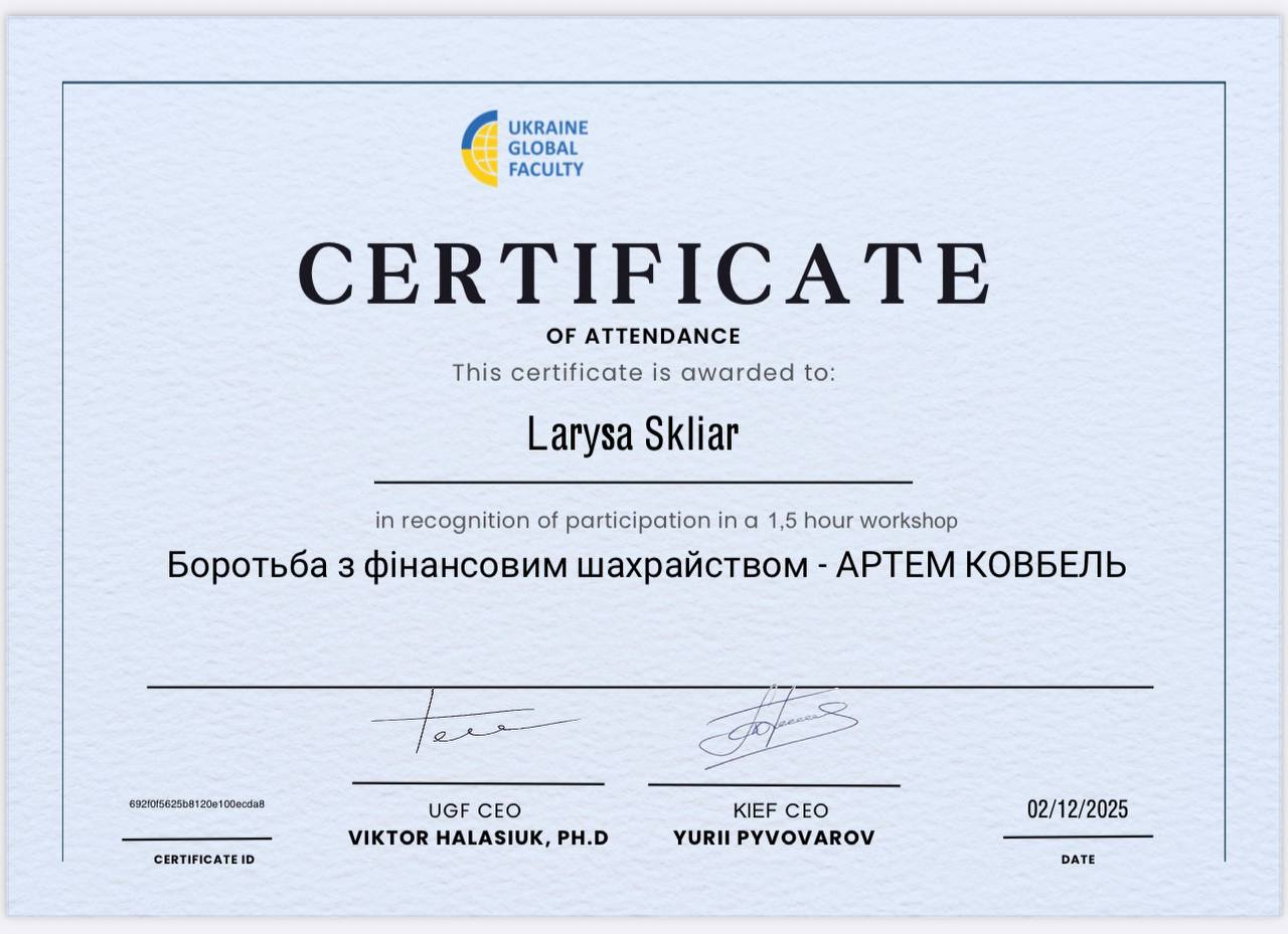 02.12.2025 року викладачі кафедри Фінансів, обліку та аудиту ОНТУ та здобувачі спеціальності D2 “Фінанси, банківська справа, страхування та фондовий ринок» ОНТУ пройшли навчання на міжнародній платформі UKRAINE GLOBAL FACULTY на тему «Боротьба з фінансовим шахрайством»